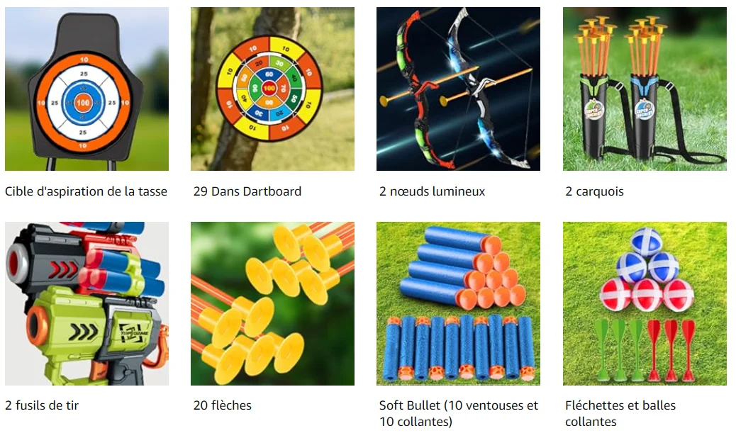 2 Targets for Versatile Fun – This shooting toy set includes a suction cup shooting target (standing and hanging) and a 29-inch sticky dart target. 2 bows with LED lights (battery not included), 20 suction cup arrows, 2 adjustable shoulder strap quivers, 2 foam dart shooting guns, 20 foam darts (10 suction cup and 10 sticky), 6 sticky darts, 6 sticky balls. Enhanced Playing Experience – The 2 Pack bow and arrow toy is designed for kids ages 5-11, making it an inclusive choice for boys and girls in this age range. It offers a wide range of entertainment options that cater to different interests and play preferences.